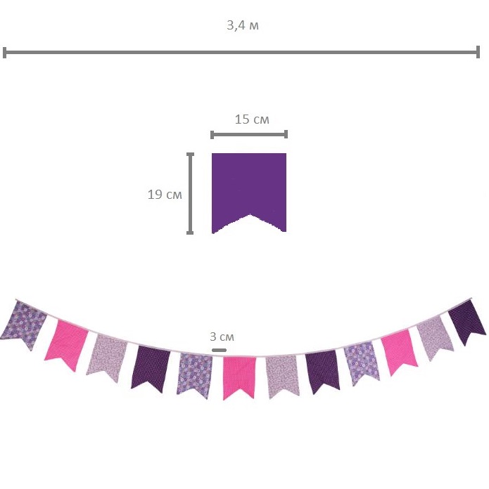 Гирлянда состоит из 12 флажков, общая длина составляет 3,4 м, расстояние между флажками 3 см, длина матерчатых флажков 2,1 м, длина лямок с обеих сторон по 50 см
