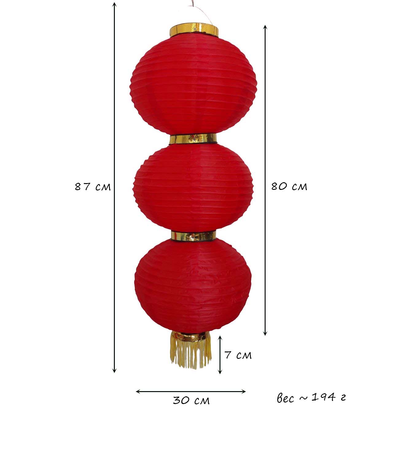 Круглый китайский фонарь состоит из трех ярусов диаметром 30 см каждый.