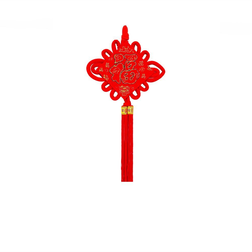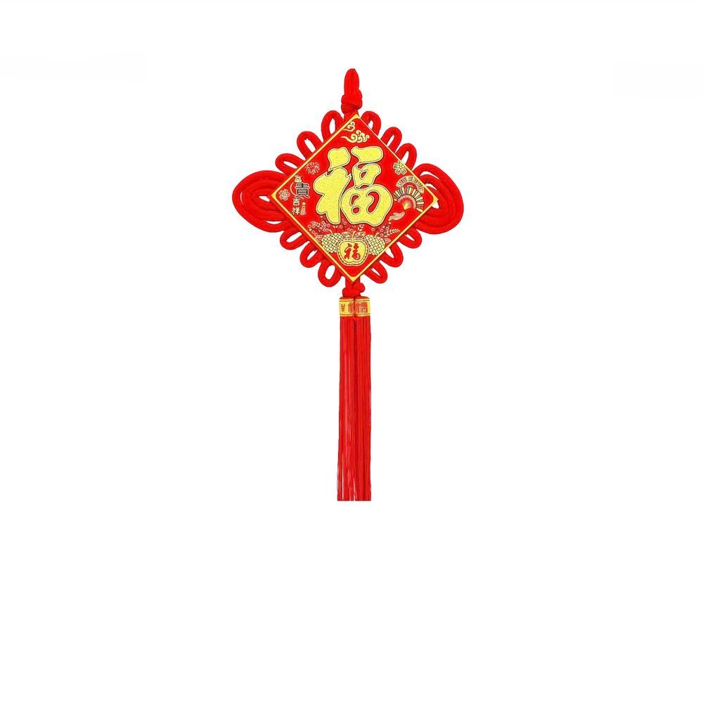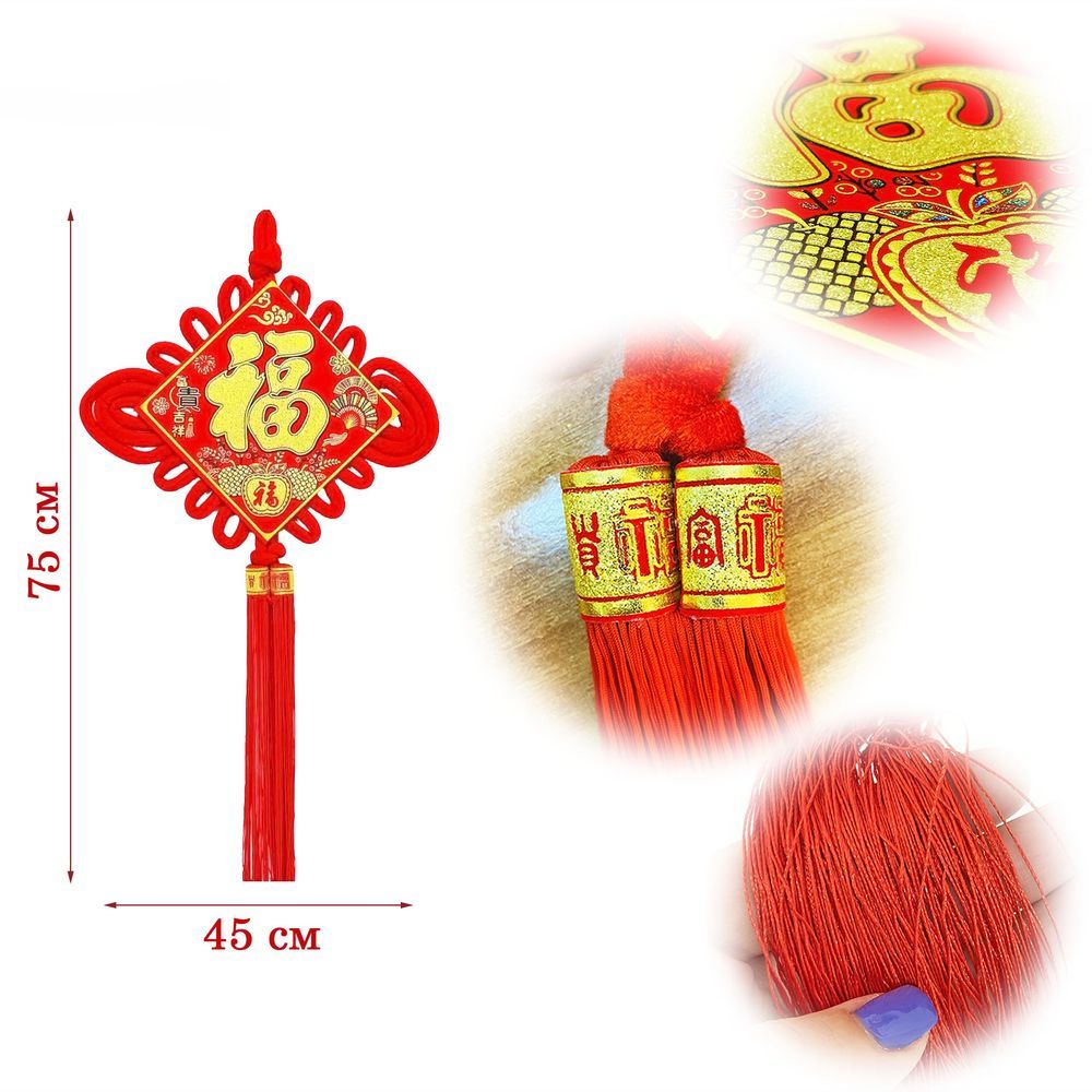 Традиционный китайский узел в форме ромба с символичным дизайном. Яркое сочетание красного бархата и золотых элементов создает эффектный акцент в интерьере.