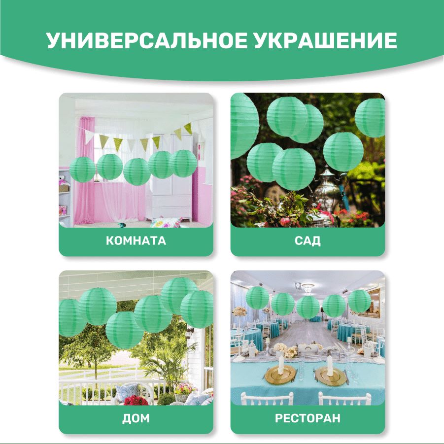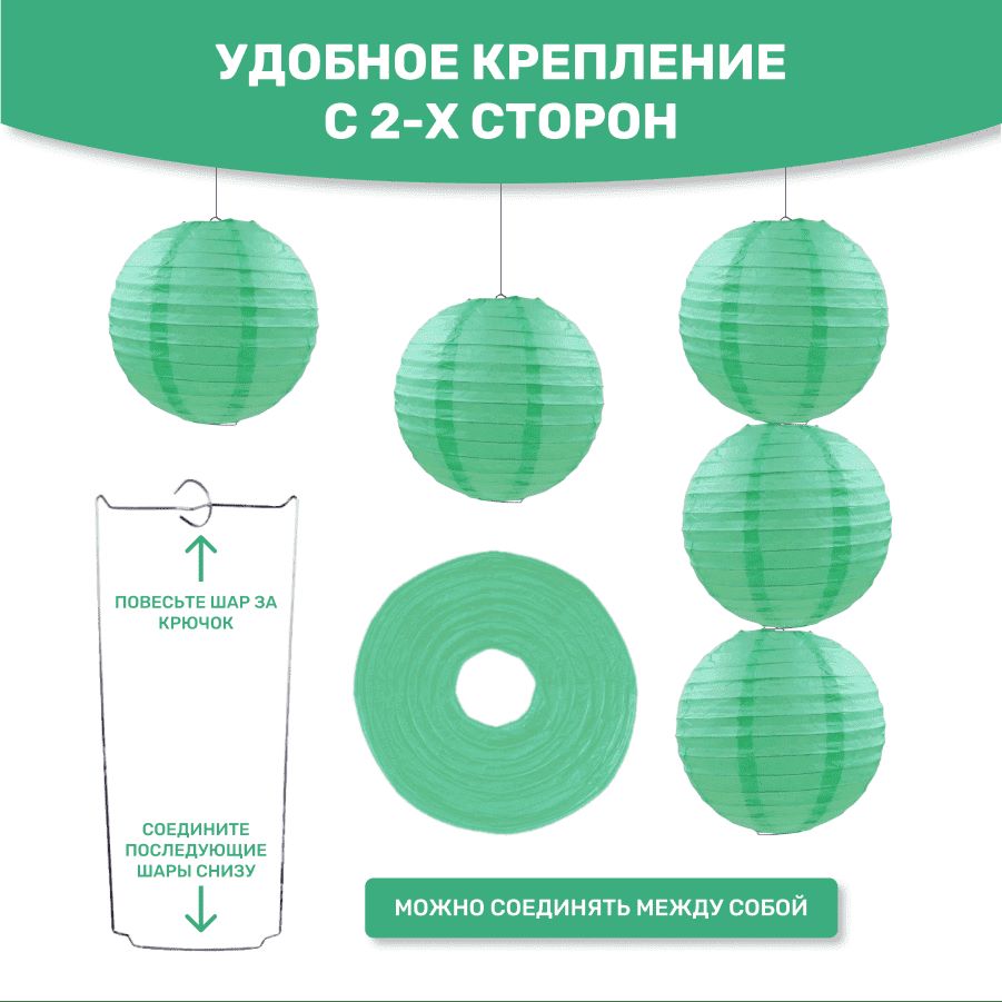 В комплект входит 8 бумажных фонариков и лента атласная.
