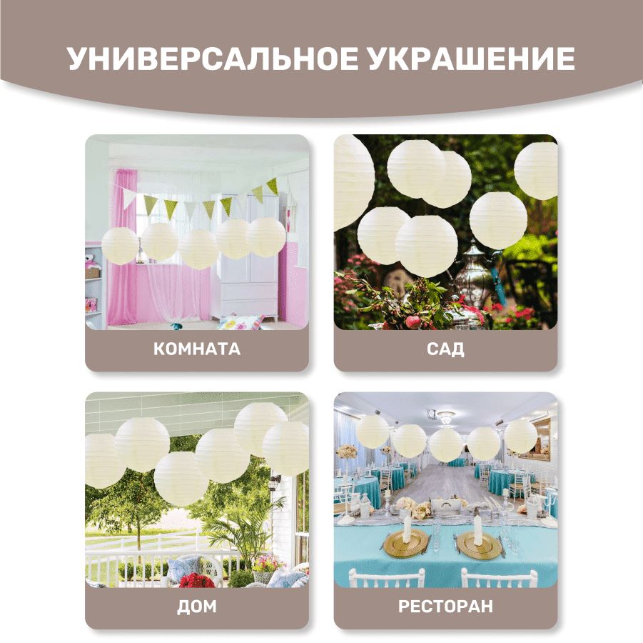 В комплект входит 8 бумажных фонариков и лента атласная.