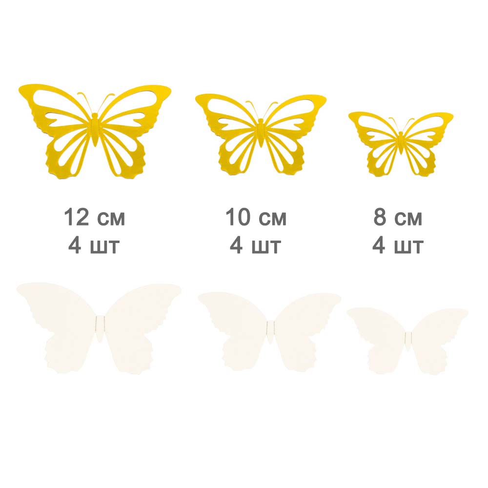 Бабочка состоят из двух частей цветная бабочка + золотая бабочка с перфорацией. Соединяются между собой клейкими кругами, которые идут в комплекте.