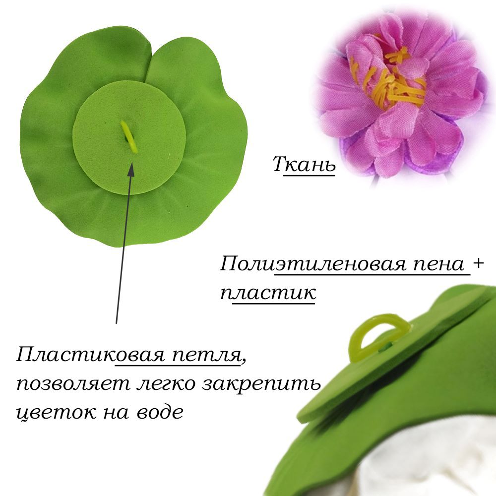 Легко плавает на воде благодаря пластиковой петле под цветком и пенопласту.