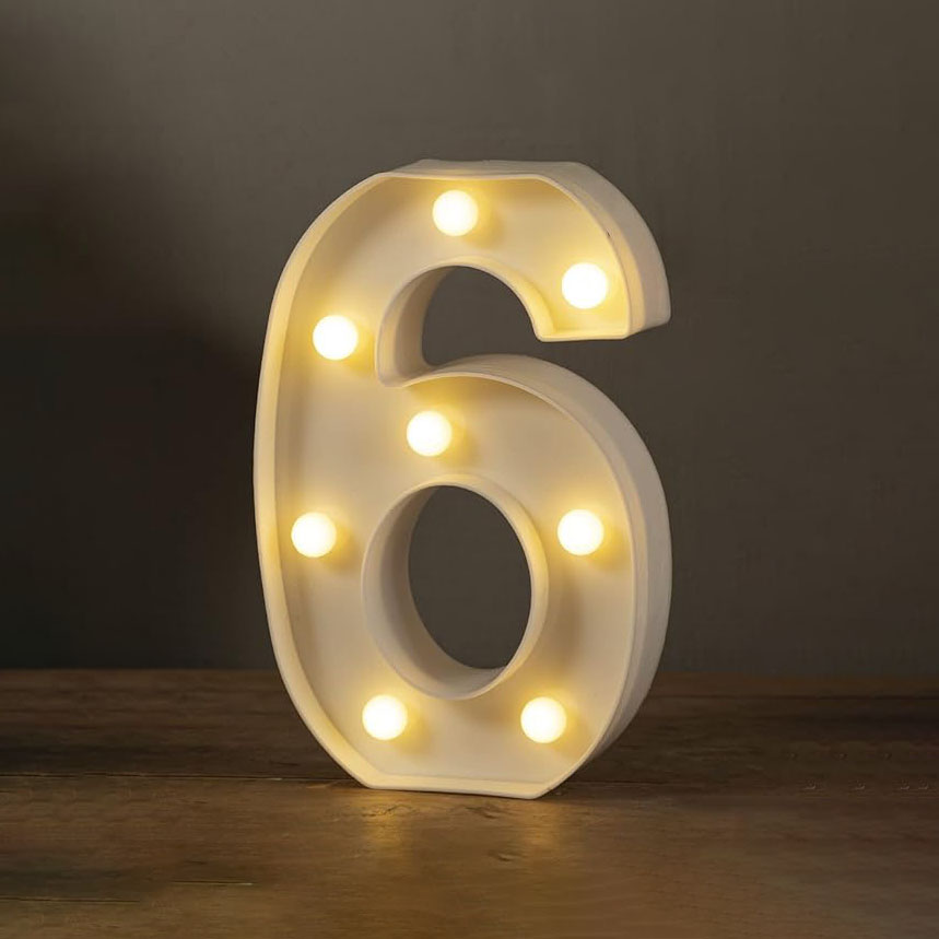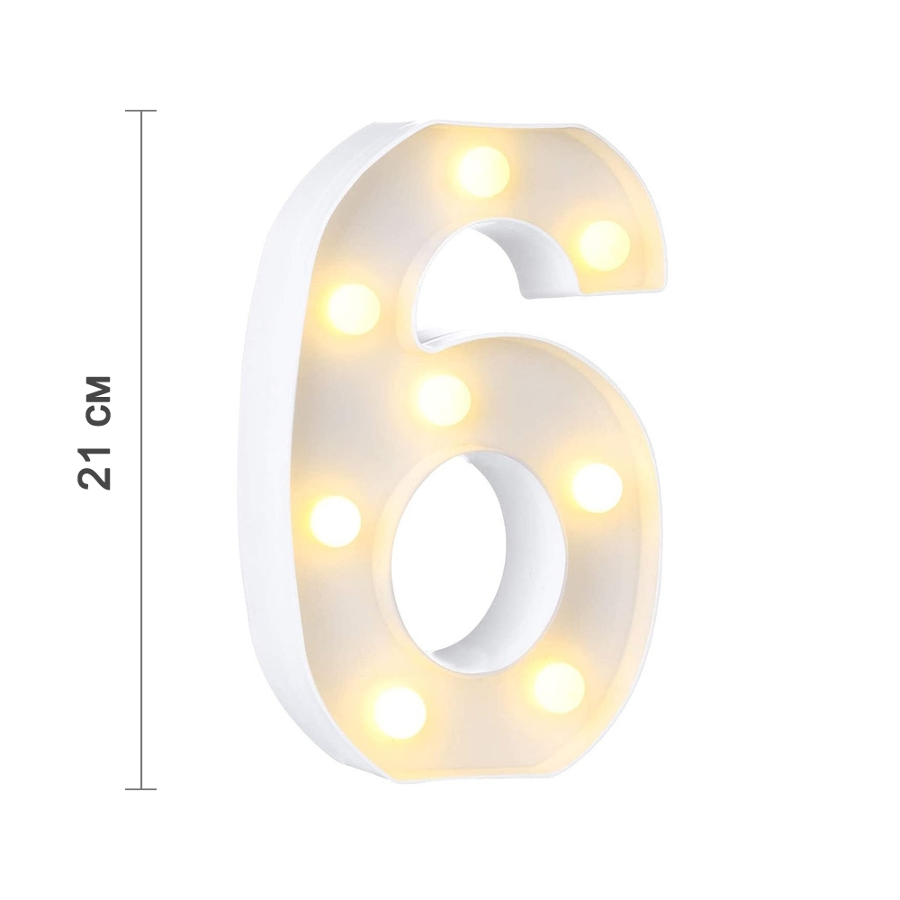 Цифра 6 светодиодная 21 см, от батареек , теплый белый